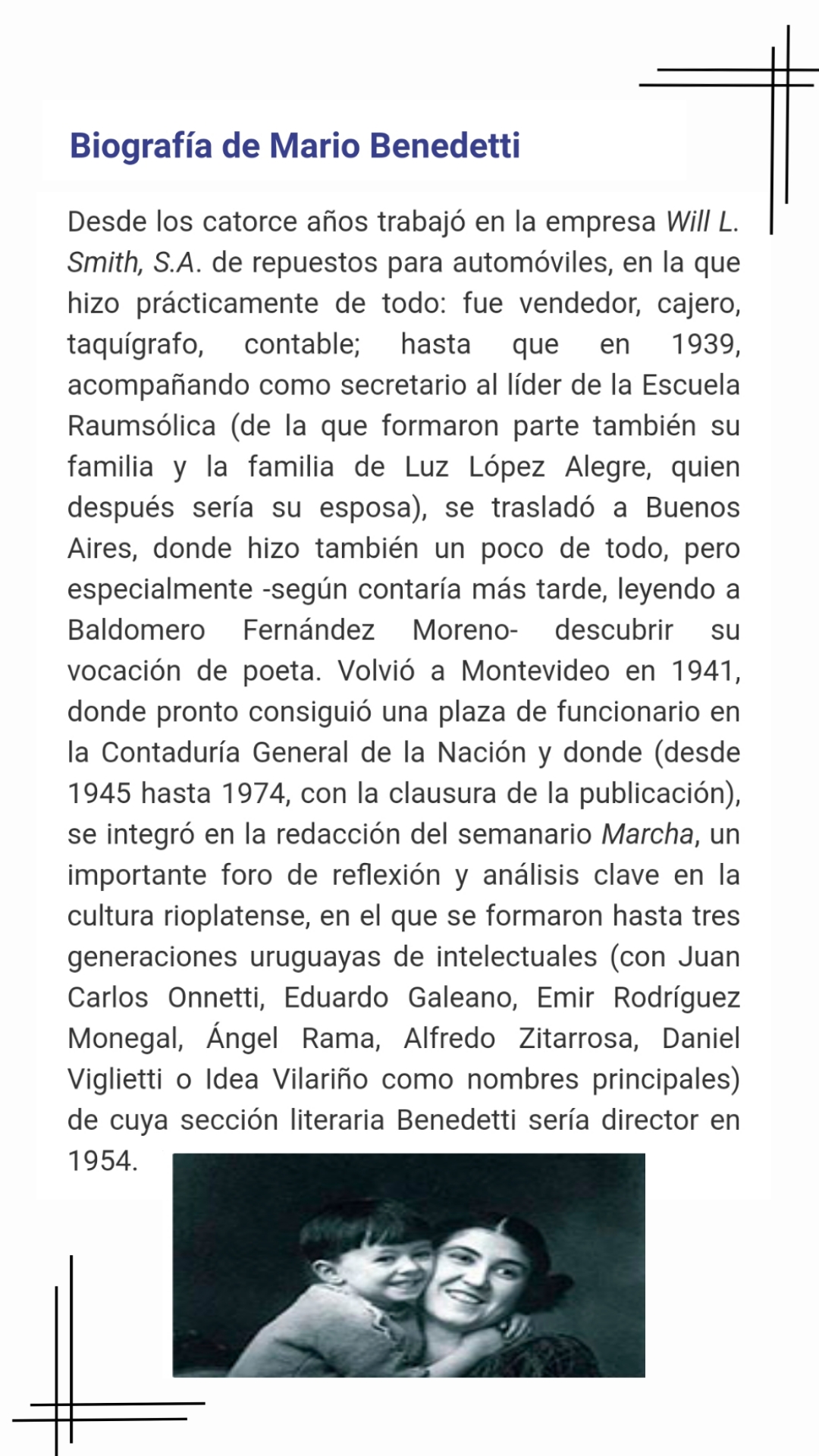 Actividades y Biografía de Mario Benedetti UNIDAD EDUCATIVA EUGENIO ESPEJO NOMBRE :GUARNIZO CAJAS JOFFRE ADONYS DE:2 de bachillerato BGU «B « Comparte esto: Haz clic para compartir en X (Se abre en una ventana nueva) X Haz clic para compartir en Facebook (Se abre en una ventana nueva) Facebook Me gusta Cargando... Relacionado Publicado por GUARNIZO CAJAS 2 bachillerato BGU "b" Ver todas las entradas de GUARNIZO CAJAS